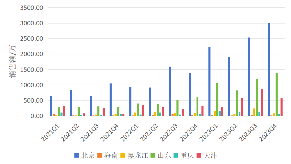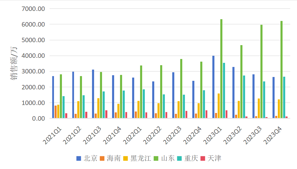 今年5月,国家医保局发布关于集采的文件以提质扩面为基调,国家与地方集采结合,指导省际牵头开展国家集采药品联盟接续采购。通过药融云IMC数据库查询2021-2023年(系统用抗感染药物)区域销售情况,挑选北京、海南、黑龙江、山东、重庆和天津六个地区进行分析比较。
