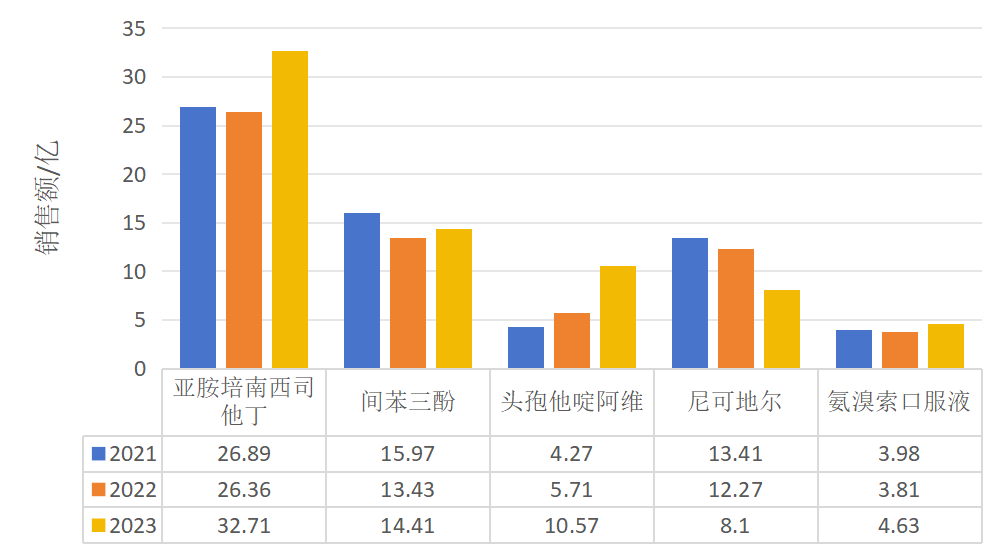 图1. 五种药品2021-2023年间院端销售额