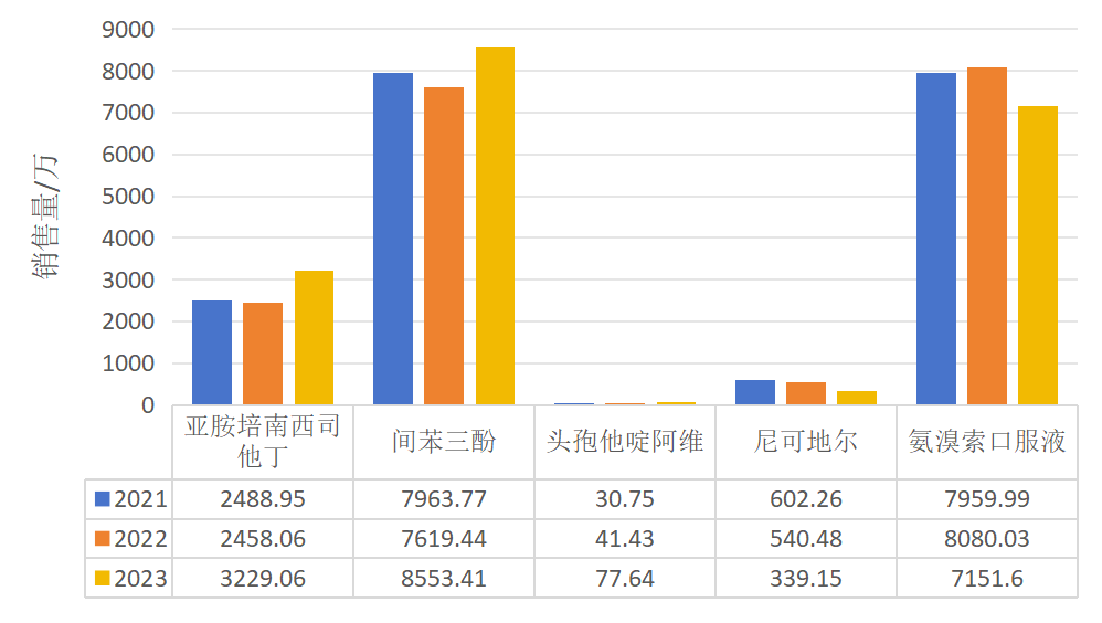 联系图2数据可得,亚胺培南西司他丁和间苯三酚三年间销售量与销售额变化趋势一致,可见两者联系呈正相关紧密相连。氨溴索口服液在2022年的销售额对比2021略降,但销售量增加,可能与当年具体价格变动有关。尼可地尔销售额与销售量变化一致,呈逐年下降趋势。其销售量虽然较其他品种较少,但销售额在市场份额中可观,与亚胺培南西司他丁相似。头孢他啶阿维销售额与销售量正相关,呈逐年上升趋势。