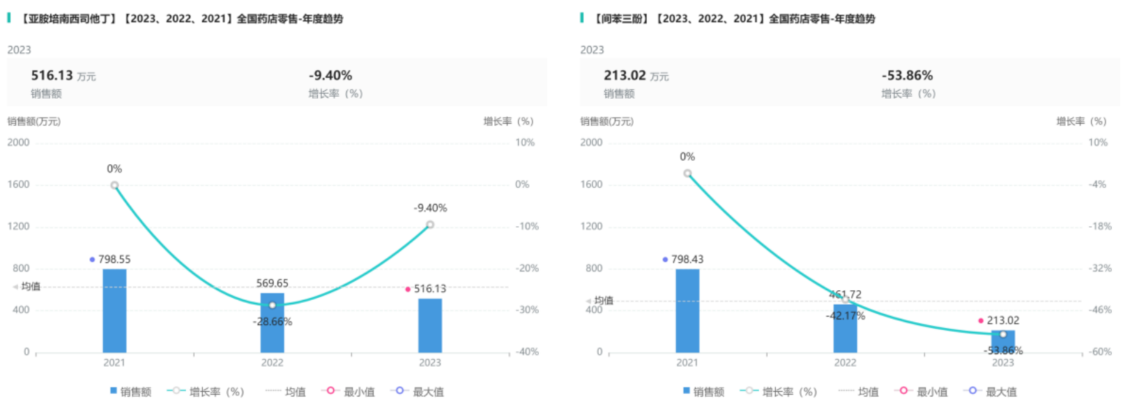 通过药融云数据库检索到的五种药品药店零售情况可知:亚胺培南西司他丁和间苯三酚(图3)销售额逐年下降。亚胺培南西司他丁在2022年降幅达到最大,增长率为-28.66%。间苯三酚三年间在2023年销售额最低为213.01万元,增长率为-53.86%。