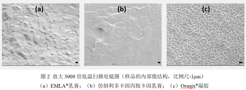 - 乳膏显微镜图像显示乳滴粒径直径为1-3μm,而Oraqix®凝胶是均匀无乳滴的体系。在低温扫描电子显微镜(cryo-SEM)下,乳膏表现出与凝胶不同的微观结构(图2)。