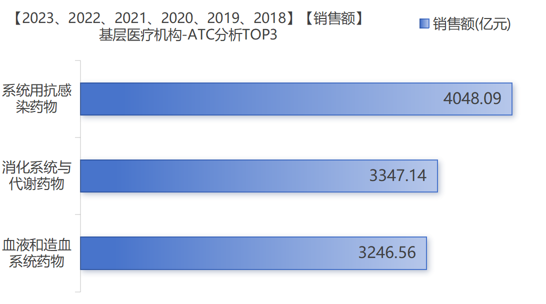 基层医疗机构系统用抗感染药物、消化系统与代谢药物和血液和造血系统药物等慢病药物贡献了该渠道西药规模的一半,排行详见图8。