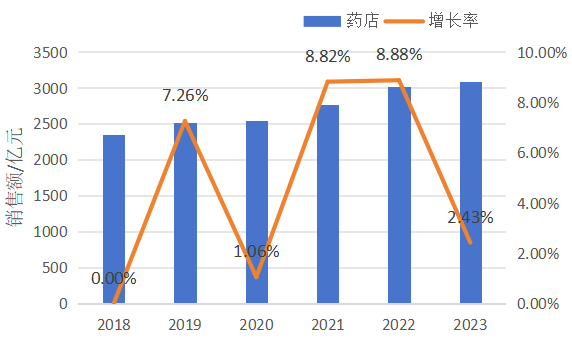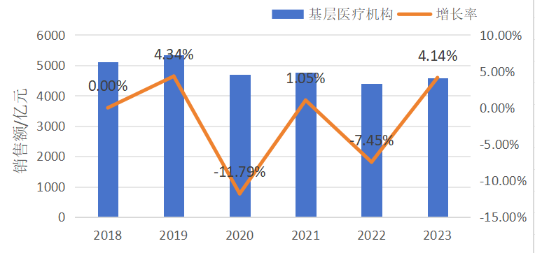 (2)2022年,疫情管控政策宽松之后,全国医院及基层医疗机构销售额增长率为-1.37%(图2)和-7.45%(图3),药店销售额增长率8.88%(图4)。2022年只有药店销售额呈增长趋势,该情况可能与集采、国谈、疫情后处方外流群众抢屯药品之风等原因有关。