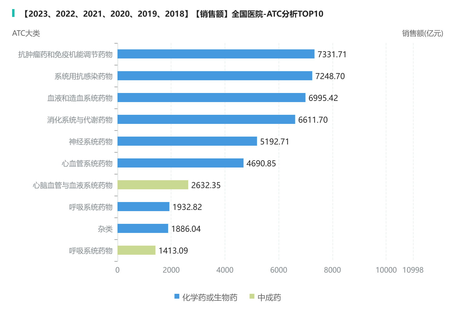 全国院端抗肿瘤药和免疫机能调节药物位居第一,其次为系统用抗感染药物和血液和造血系统药物(图7)。二者主要以化药为主,中成药占比较低。