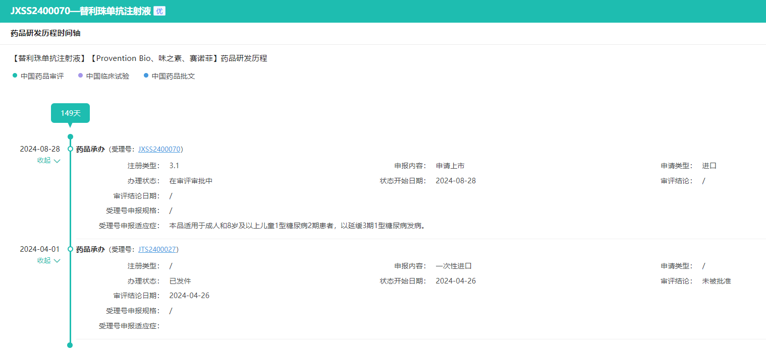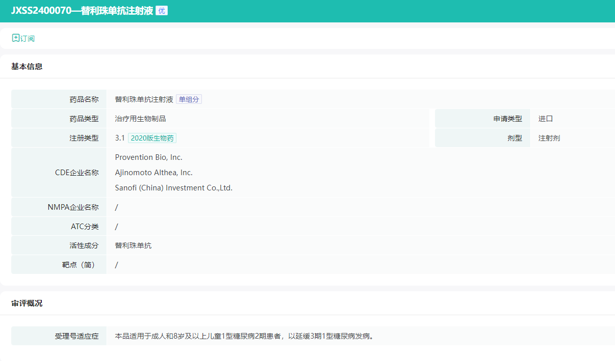 8月27日,赛诺菲(Sanofi)申报的替利珠单抗注射液的上市申请获得受理。就在上周,该药物被CDE纳入优先审评,用于成人和8岁及以上儿童1型糖尿病2期患者,以延缓3期1型糖尿病发病。替利珠单抗是一种“first-in-class”CD3靶向单克隆抗体,它能从病因上实现对胰岛β细胞的保护,进而延缓1型糖尿病发病近3年。该药于2022年11月在美国获批(商品名为Tzield),用于延缓成人和8岁及以上儿童1型糖尿病患者从2期进展为3期。这也是FDA批准的首个延缓1型糖尿病发病的创新靶向疗法。