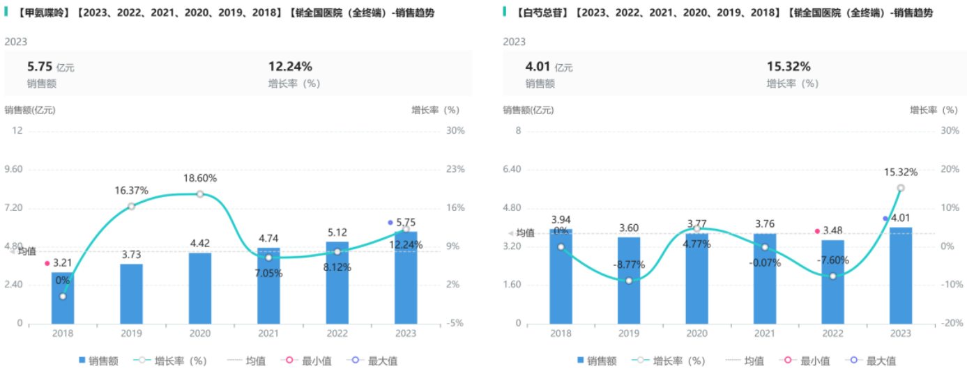 甲氨蝶呤销售额呈逐年持续增长趋势,在2023年达到最高值,为5.75亿元,增长率在2020年最高,为18.60%。白芍总苷销售市场每年呈一涨一降,在2021和2022年持续降低,2022年销售额最低为3.48亿元,具体数据详见图4。