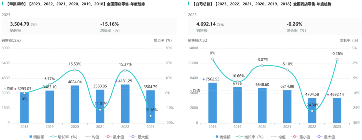 甲氨蝶呤药店零售销售额有两处下降点,分别为2021年和2023年,降幅为11.01%和15.16%,五年间极差为838.26万元(图5)。白芍总苷销售额逐年下降,2023年较2018年销售额降低2870.39万元,降幅为37.96%,其原因可能为野生原材料的减少、种植成本的增高及进入市场的壁垒较高导致[3]。