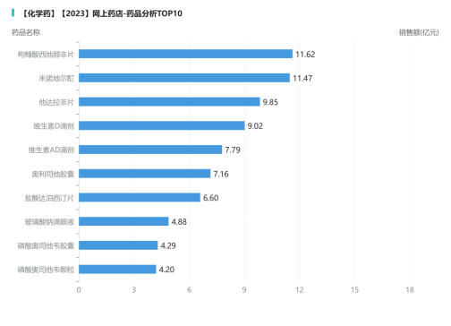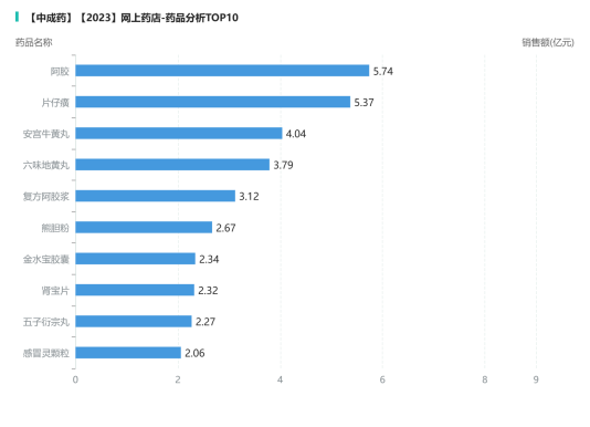 从药物类型上看,网上药店销售以化药销售为主。通过整理摩熵医药(原药融云)网上药店销售数据可见,2023年化药占比高达62%,中成药占比达35%(图3)。网上药店化药销售前两名分别为枸橼酸西地那非片和米诺地尔酊,销售额均超过了10亿元(图4);中成药销售前两名分别为阿胶与片仔癀,销售额均超过了5亿元(图5)。由此可见,网上药店销售以生理保健相关的药品销售为主。