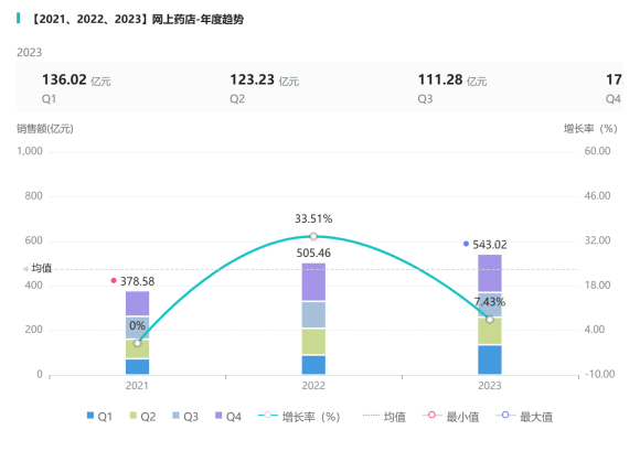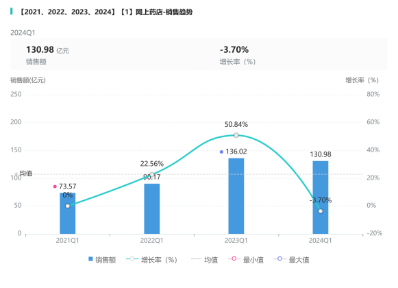 随着监管与政策的持续完善,中国网上药店销售迎来了快速增长。通过整理摩熵医药(原药融云)数据库网上药店销售数据可见,网上销售额从2021年的378.58亿增长到2023年的543.02亿,增长了43.4%(图1);截至2024年第一季度网上药店销售同比较2023年略有下降(约3.7%),较2021年增长约78%。(图2)