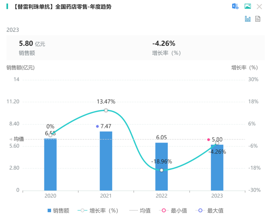 在2020年-2023年间,替雷利珠单抗院外零售仅在2021年有所增长(图4),随后两年持续下降,但总体销售额变化较小,2023年较2020年销售额下降0.78亿元。