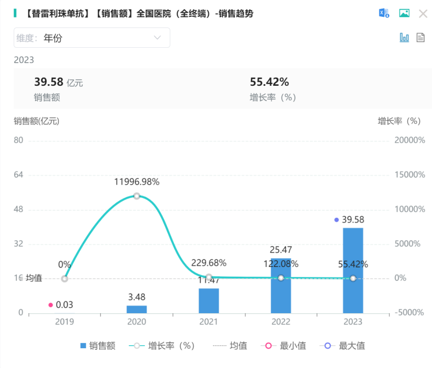 近年来,替雷利珠单抗在全球范围内的应用和发展取得了显著进展,其中国市场更凸显出这一观点。通过摩熵医药(原药融云)数据库检索院端销售情况,可以看到其销售额呈持续上涨趋势,2023年相较2020年销售额增长10倍,达39.58亿元(图3)。