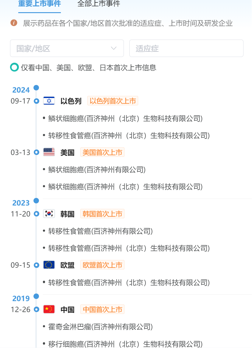 替雷利珠单抗是一款具有独特设计的人源化免疫球蛋白G4(IgG4)抗程序性细胞死亡蛋白-1(PD-1)单克隆抗体,能够以高亲和力和特异性与PD-1结合。其设计目的旨在最大限度地减少与巨噬细胞中的Fcγ受体结合,帮助人体免疫细胞识别并杀伤肿瘤细胞。今年早前,替雷利珠单抗就已获得美国食品药品监督管理局(FDA)批准。根据摩熵医药(原药融云)数据库查询到该药品重要上市时间轴如下:
