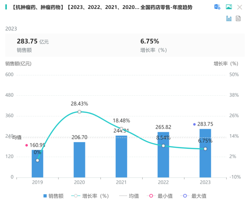 药店零售呈现稳步增长趋势,2023年较2019年销售额增长122.8亿元,增长率为76%(图6)。以上情况可能与近年来鼓励药品研发创新、抗癌药进口零关税以及加强重大疾病医保谈判等政策有关。