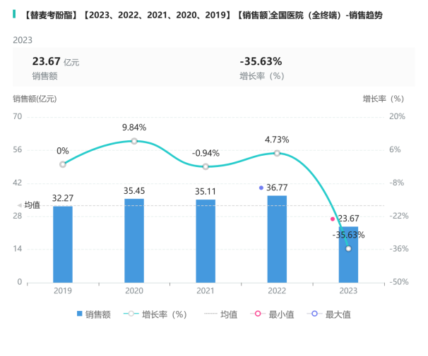 替麦考酚酯销售额浮动在2019-2022年间较为稳定,2023年对比2022年突降13.1亿元,降幅为35.63%。