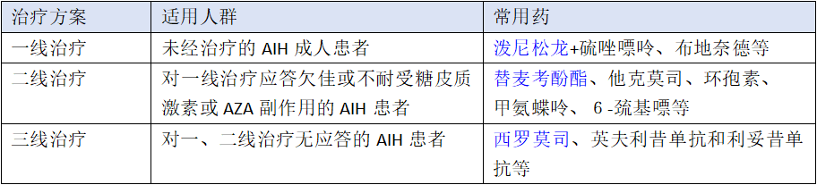 根据中华医学会肝病学分会发布于临床肝胆病杂志的《自身免疫性肝炎诊断和治疗指南》推荐,AIH治疗用药除了做肝移植术之外,药物治疗主要分为三种治疗方案,具体推荐用药如下表2所示: