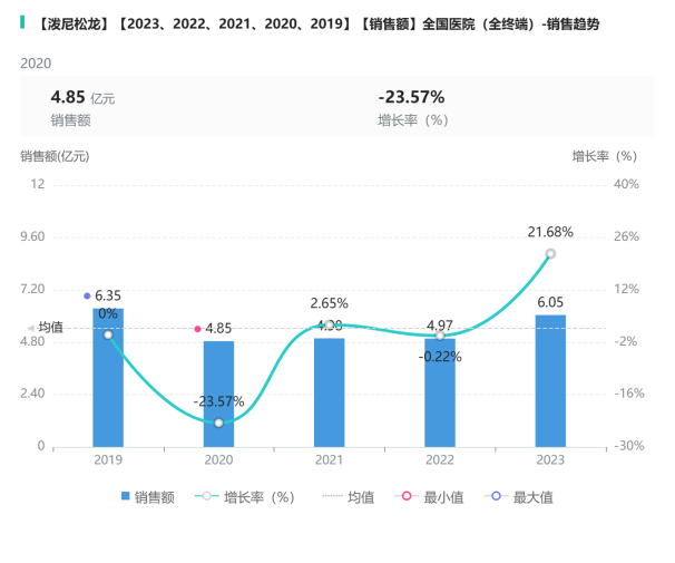 选取以上部分推荐常用药查看院端市场情况。通过摩熵医药(原药融云)数据库显示,三款药物市场都呈不断变化的现状。2019-2023年间,泼尼松龙销售额呈现“一升一降”的波浪状,2020年增长率最低,为-23.57%(对比2019年)。