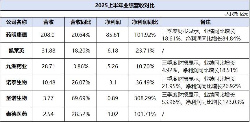 诺泰生物、圣诺生物与泰德医药构成了“高增长阵营”。其中,圣诺生物的表现尤为突出,其营收与净利润分别以69.69%和308.29%的惊人增速“领跑”全场,尽管基数较小,但显示出极强的业务弹性与盈利能力的快速释放。除此之外,圣诺生物、泰德医药和诺泰生物的净利润增速均远高于其营收增速。