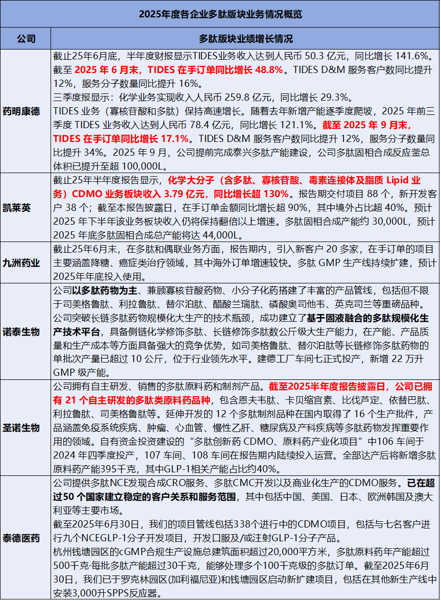 在整体业绩的背后,各公司在多肽这一核心赛道上的业务质量、技术路径与战略重心呈现出显著差异。