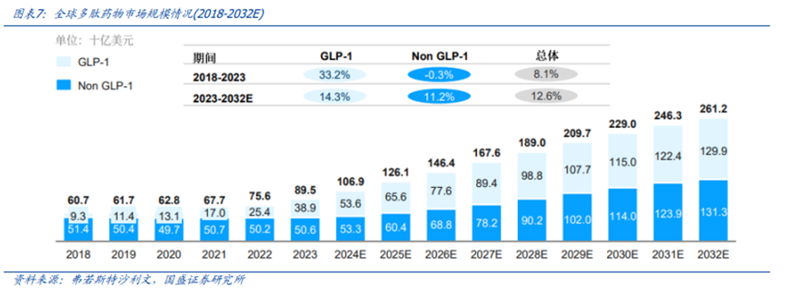据弗若斯特沙利文预测,全球多肽药物市场至2032年将达2612亿美元,年复合增长率约12.6%;其中GLP-1赛道增速更高。目前全球约65%的多肽原料药生产采用外包模式,而中国市场的发展速度快于全球,预计2030年国内多肽CDMO规模将达185亿元。