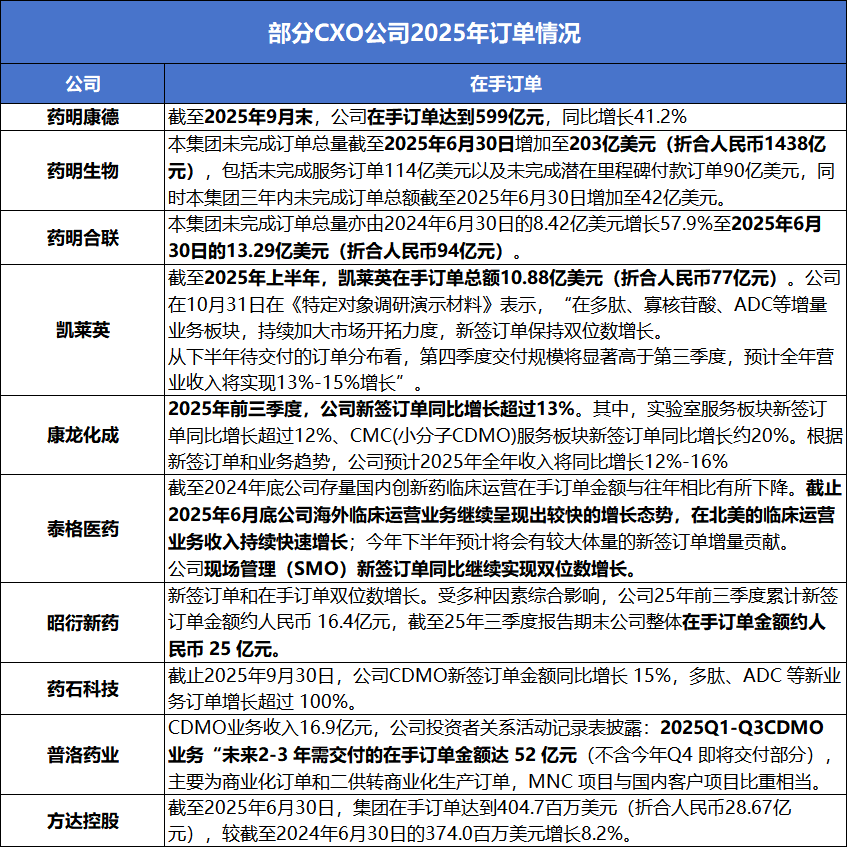 在行业整体向好的趋势下,头部企业凭借差异化优势,在订单获取上进一步拉开差距。我们将围绕包括药明康德、凯莱英、泰格医药、药石科技等在内的多家主流CXO企业在当下的订单表现与业务亮点。