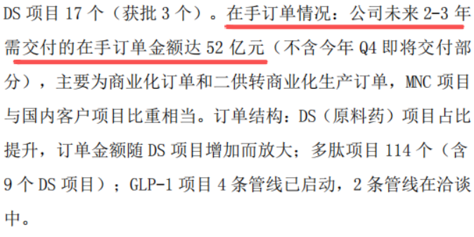 核心订单表现:CDMO业务在手订单达52亿元。