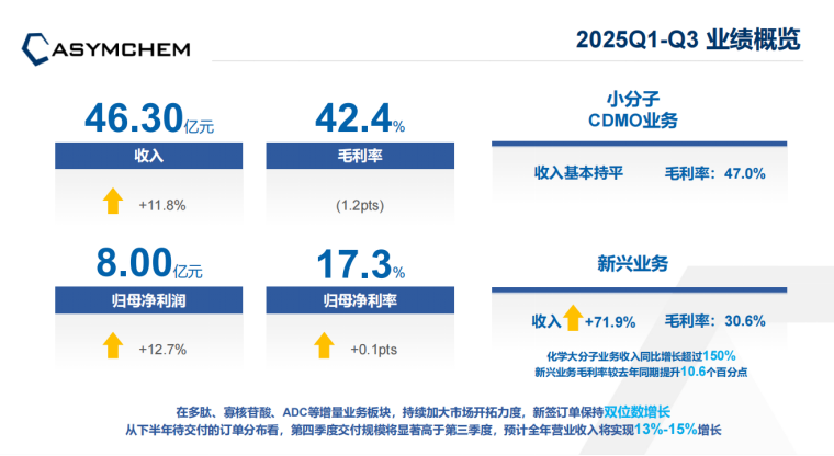亮点:在小分子CDMO领域的基本盘依然坚实。更值得关注的是,其在多肽、寡核苷酸、ADC等新兴业务板块展现出强大的增长动能,新签订单保持双位数增长。公司明确指出第四季度交付规模将显著提升,这预示着下半年订单执行加速,全年增长目标13%-15%可期。