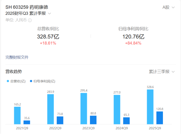 作为CXO龙头的药明康德交出了一份超市场预期的成绩单。2025前三季度实现营业收入328.57亿元,同比增长18.61%;归属于上市公司股东净利润120.76亿元,同比大增84.84%。