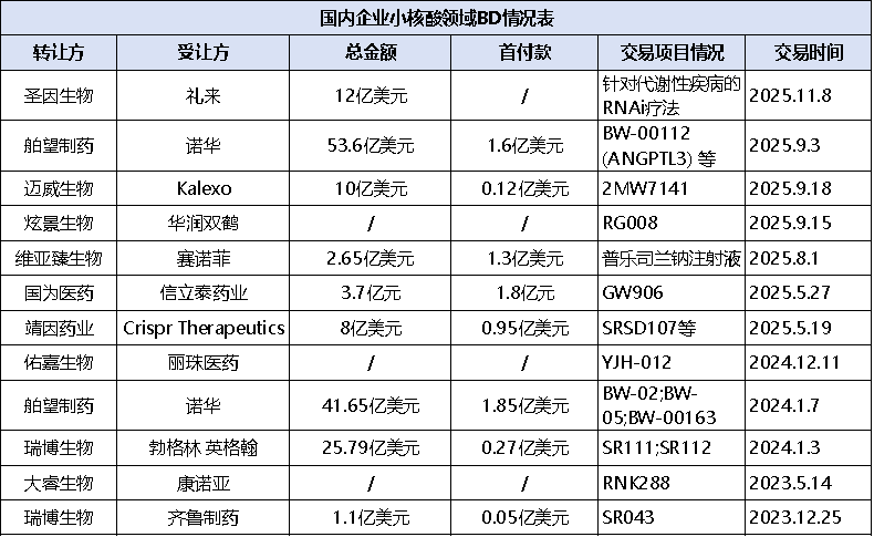 市场的繁荣直接激发了资本与产业间的联动。近年来,中国小核酸领域的BD交易异常活跃。其中,舶望制药在2024年及2025年两度将产品权益授权给诺华,协议总金额累计近百亿美元,创下行业纪录。