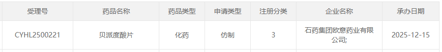 12月15日,据CDE官网显示,石药集团欧意药业按化药注册分类3类申报的贝派度酸片临床申请获受理,目前,国内尚无该品种仿制药获批。