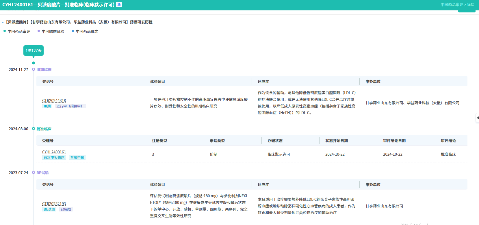 目前,贝派度酸片原研药及仿制药均未在国内上市,国内药企想要分一杯羹,需完成Ⅲ期临床试验才能获批上市,这无疑提高了市场准入门槛。在这场激烈的仿制竞争中,甘李药业、江西施美药业和合肥立方制药3家企业已抢先一步获得临床批件。其中,甘李药业在2023年就完成了BE试验,2024年10月22日获批临床,11月27日进入Ⅲ期临床,进度领先。石药集团此次入局,竞争格局再生变数。