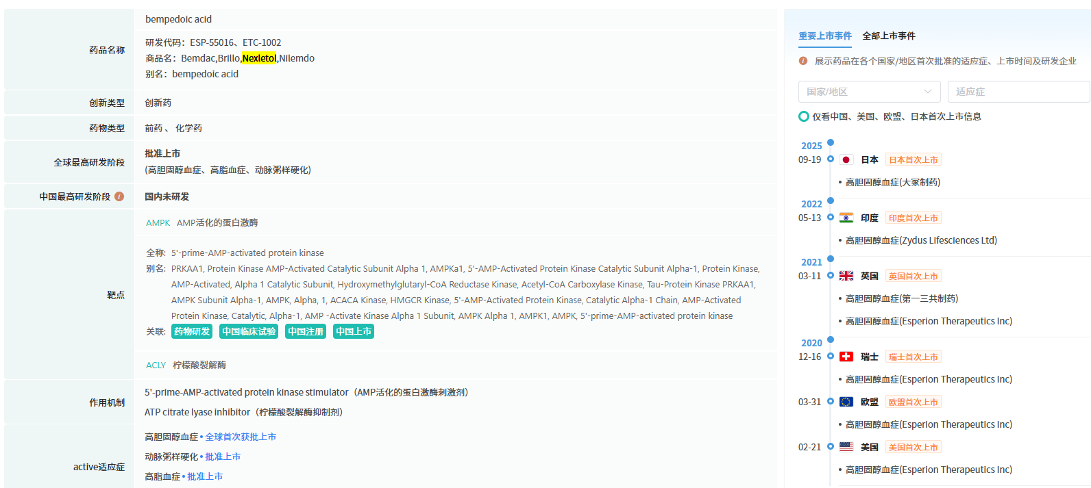 贝派度酸(商品名:Nexletol)由Esperion研发,是ACLY抑制剂。2020年2月,该药获美国FDA批准,3月获EMA批准,成为近20年来FDA首次批准的口服非他汀类降胆固醇药物。作为新型非他汀类降脂药,它既能抑制肝脏胆固醇合成,又能上调肝细胞表面LDL-C受体,促进“坏胆固醇”被肝脏吸收。