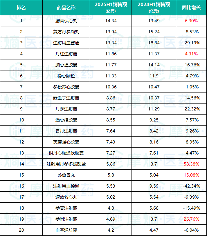 2025H1医院终端中成药市场心脑血管疾病用药TOP20