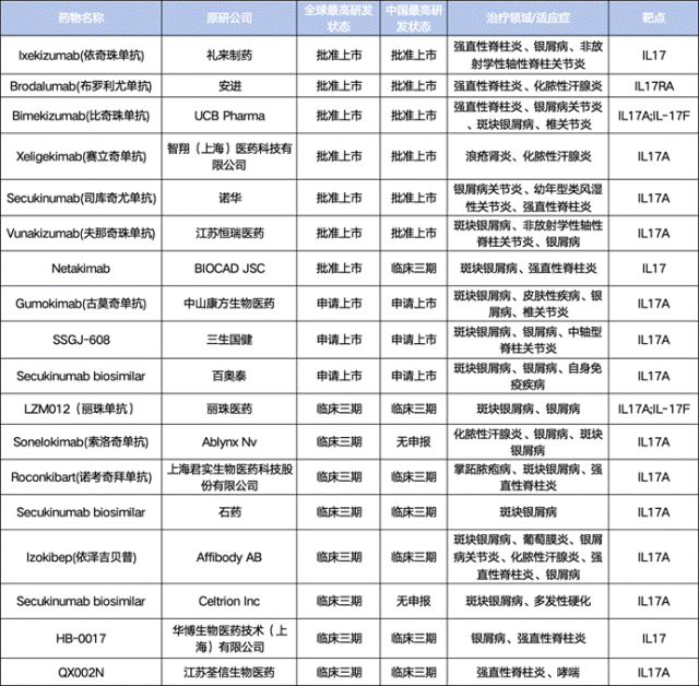 在自免疾病领域,IL-17作为成熟靶点,研发竞争日趋激烈,渐成红海,其激烈程度堪比PD-1。目前,靶向IL-17的药物仍以单抗为主,全球已有7款IL17单抗药物获批上市,多款生物类似药“扎堆III期”;尚无IL-17小分子药物获批上市,但是慢病治疗领域,由“针头”转向“药丸”的趋势,开发IL-17小分子抑制剂正是行业寻求差异化竞争的新策略。