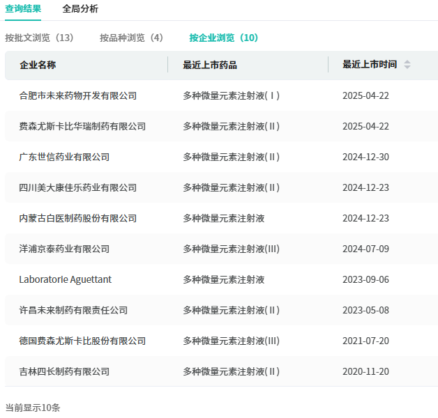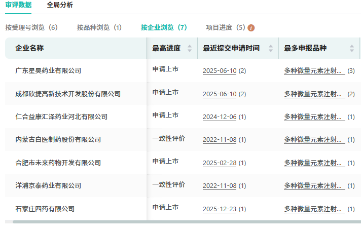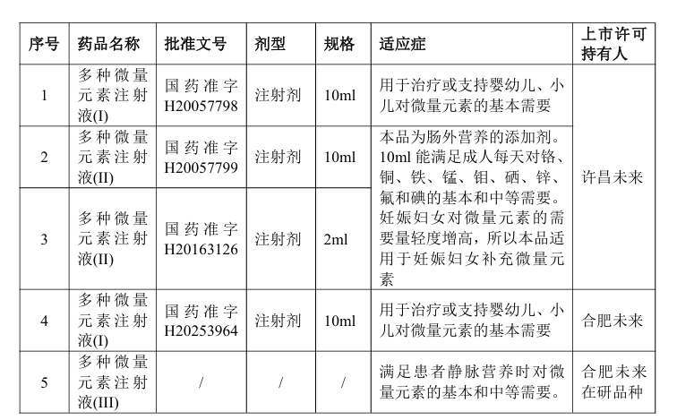 除了已获批的两家企业外,仁合益康、合肥未来药物等企业的多种微量元素注射液(Ⅲ)上市申请目前正处于审评审批阶段。算上刚刚提交申请的石家庄四药,总共不超过7家企业在竞争这个品种。