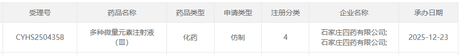 收购热潮未歇,市场准入的争夺已同步上演。12月23日,石家庄四药的多种微量元素注射液(Ⅲ)上市申请正式获CDE受理,预示着这一赛道的竞争即将进入新阶段。