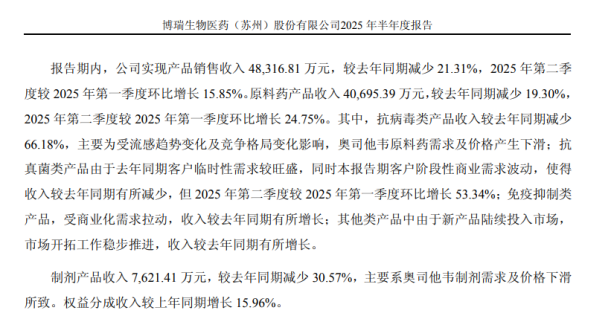 博瑞医药业绩短期波动,研发保持稳定投入在2.16亿元,研发费用率高达24.7%。 2025年上半年,公司实现产品销售收入4.83亿元,同比减少21.31%。业绩的短期压力主要源于传统优势业务的周期性波动与竞争加剧:其一,核心抗病毒产品(奥司他韦)原料药及制剂,受流感趋势与市场竞争影响,需求与价格同步下滑,相关收入显著减少;其二,部分抗真菌产品因客户需求的阶段性波动,收入亦有所回调。