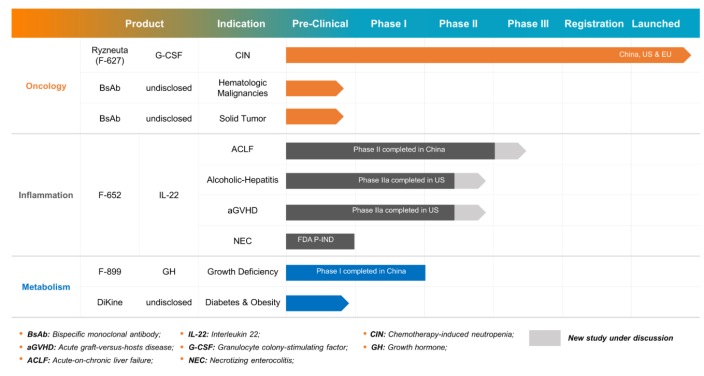 亿帆医药在血液肿瘤、自身免疫疾病领域布局,长效升白药 F-627(艾贝格司亭α注射液) 已在中国与美国获批上市。同时用于移植物抗宿主病(GvHD)与自身免疫性肝炎的 F-652(IL-22-Fc融合蛋白)已进入II期临床。通过战略收购美国Generon快速获得“双分子”与“免疫抗体”两大国际化生物药研发平台。