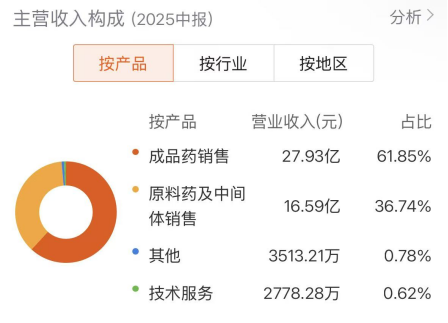 华海药业在营收利润承压之下,研发逆势增长20.66%至8.3亿,研发费用率达13%。战略投入期特征明显,短期业绩压力主要来自传统业务竞争及对创新研发与高端产能的持续高投入,转型决心坚定。从主营收入构成来看,目前华海的主要收入还是来自于成品药销售和原料药、中间体的销售。