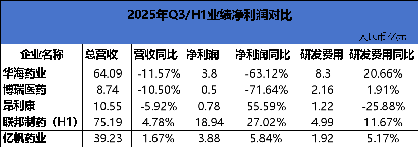 华海药业与博瑞医药净利润出现较大下滑,但研发投入持续加码。联邦制药与亿帆药业则实现了营收与利润的稳健增长;昂利康在利润端表现突出,但研发投入有所调整。