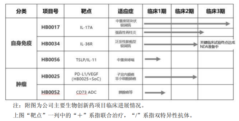 华海药业聚焦肿瘤及自免领域、自免领域,HB0034申报上市阶段,HB0017 处于 III 期临床阶段,HB0025的子宫内膜癌、非小细胞肺癌等适应症处于II期及III期阶段。