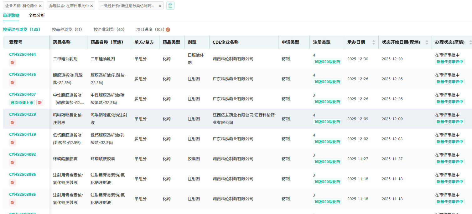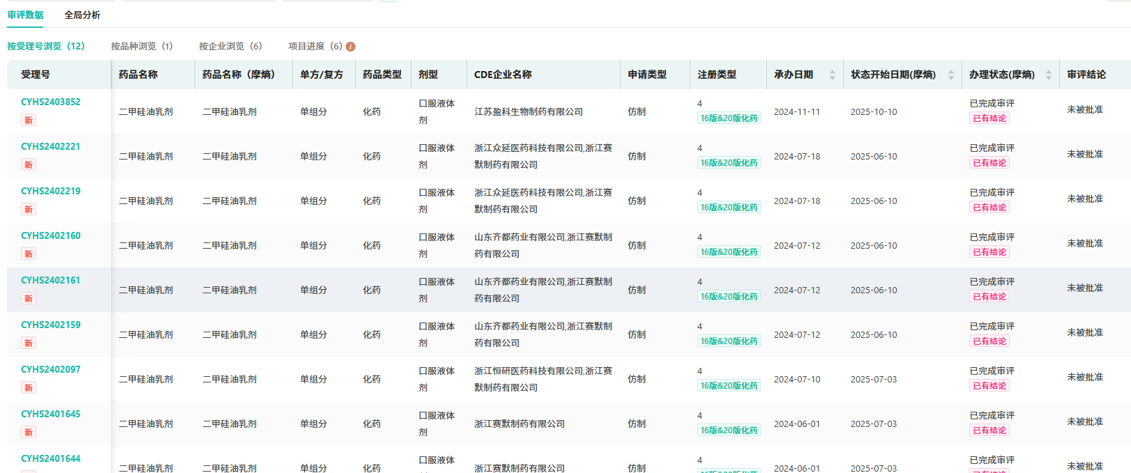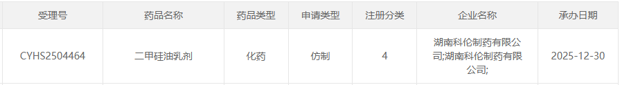 在医药行业的激烈竞争中,二甲硅油乳剂这一赛道近期备受关注。今年有6家药企连续收到驳回通知、累计拒批件达12项的严峻形势下,湖南科伦制药于12月30日递交的二甲硅油乳剂上市申请获CDE受理,强势入局。