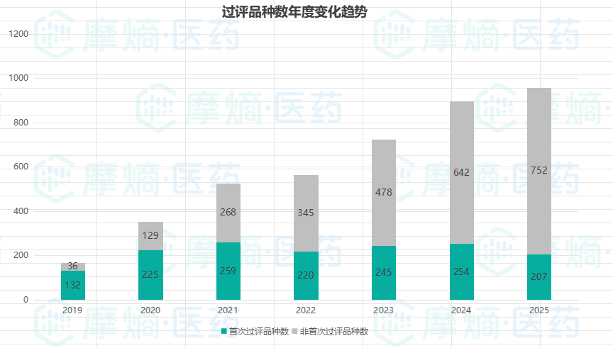 数据印证了这一趋势。2022至2024年,共有超277款首仿药获批,且数量逐年递增。2025年,尽管面临严苛环境,首仿药市场依然坚韧,全年仍有 959 款仿制药品种通过或视同通过一致性评价。其中 207 款为首家过评,占比超两成,更有 122 款重磅首仿药物获批上市。