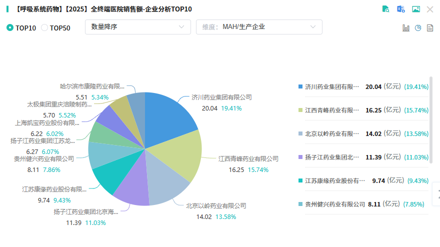 2025年上半年数据显示,13款独家品种占据TOP20榜单主导地位,其中喜炎平注射液、痰热清注射液、连花清瘟颗粒三款明星品种销售额均突破10亿元。康缘药业凭借拳头产品强势跻身企业销售额前五,呼吸领域竞争力凸显。