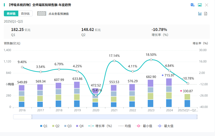 中国疾病预防控制中心最新数据显示,2025年第50周(12月8日至14日),哨点医院流感样病例呼吸道样本病原体检测阳性率中,流感病毒以50.2%居首,本周我国流感活动出现下降,但总体仍处于高流行水平。 抗流感用药市场持续扩容。2023年中国抗流感用药市场规模达107.4亿元,同比增长197.51%。头豹研究院预测,2024-2028年该市场年复合增长率将达20.2%,2028年规模有望突破269亿元。 呼吸系统中成药已成为院内市场重要支柱。2024年呼吸系统中成药在全终端院内销售额超700亿元,同比增长4.84%。