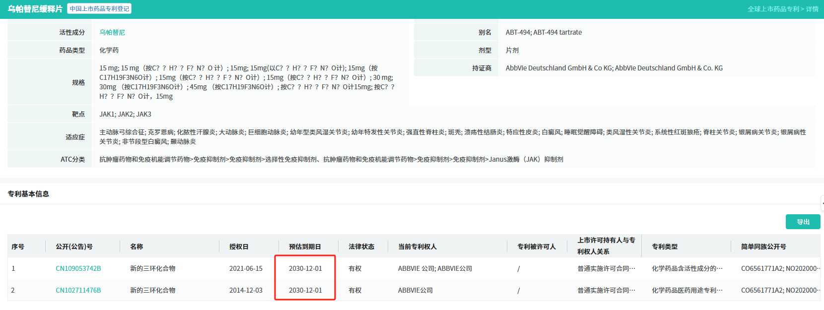 乌帕替尼缓释片 是由艾伯维开发的一款口服JAK抑制剂,用于治疗类风湿关节炎、特应性皮炎、银屑病关节炎等自身免疫性疾病,目前已纳入国家医保乙类药目录。
