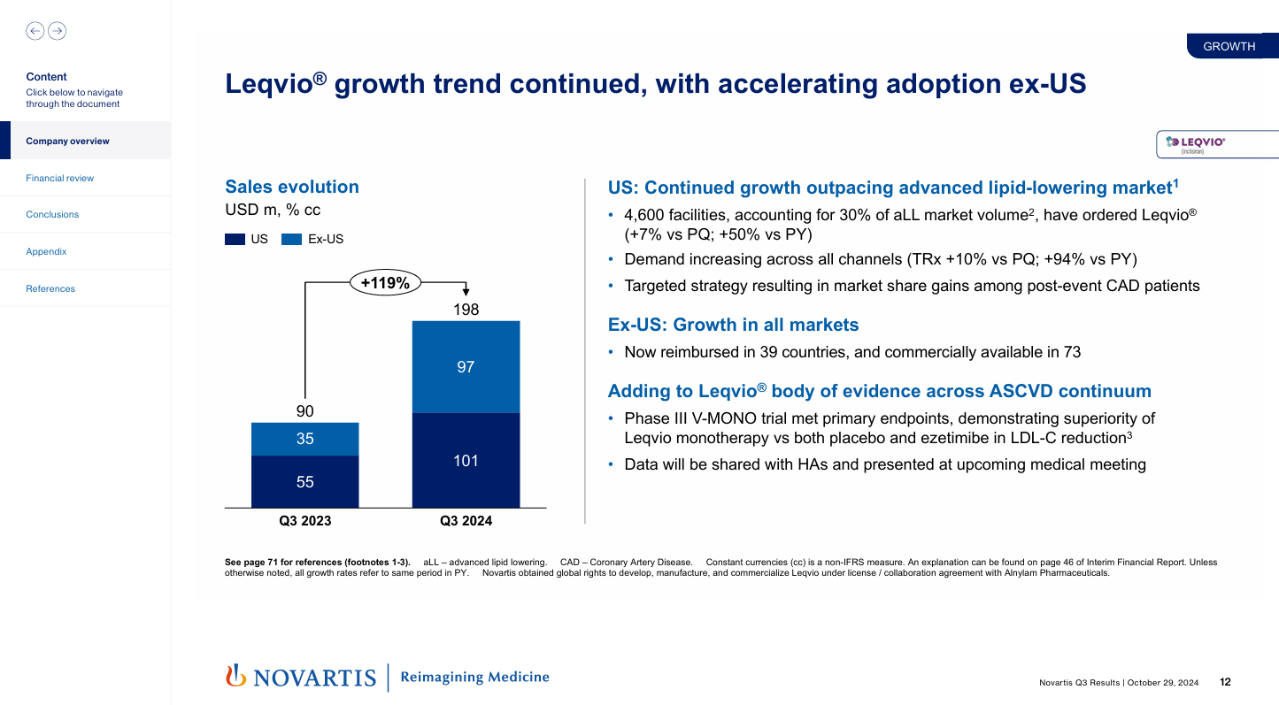 Leqvio(英克司兰)虽然也承受着来自依洛尤单抗、托莱西单抗等PCSK9单抗的竞争压力,但增长势头良好。诺华仍然在继续扩展Leqvio的应用边界,已计划提交该药物用于降低低或中等ASCVD风险患者的LDL-C水平的上市申请。