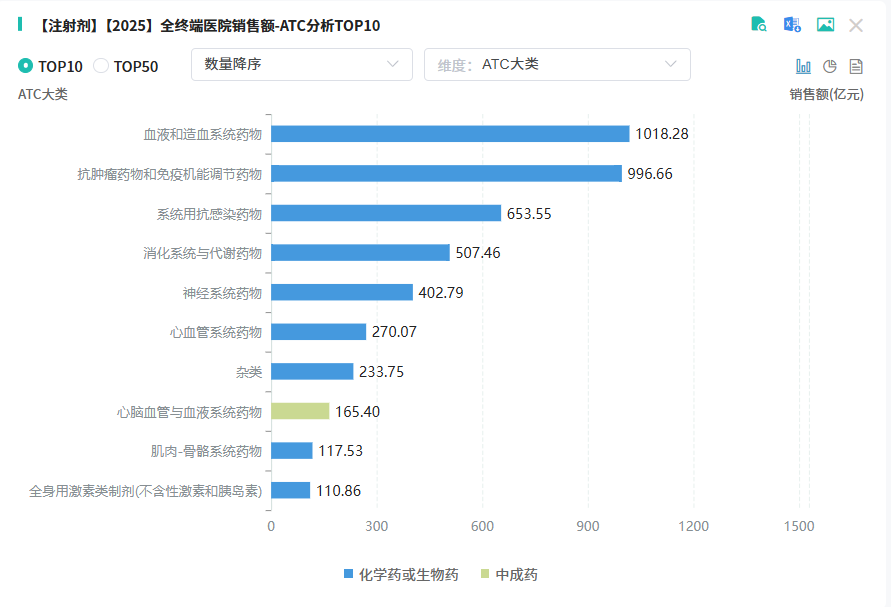 据摩熵医药数据库显示,2025年Q1-Q3全终端医院市场(化药+生物药+中成药)中,注射剂销售额突破 4500亿元,同比下滑 9.76%。品类结构中,生物药占比升至52%,化学药占42%,中成药稳定在6%,心脑血管类依旧是中成药的销售主力。