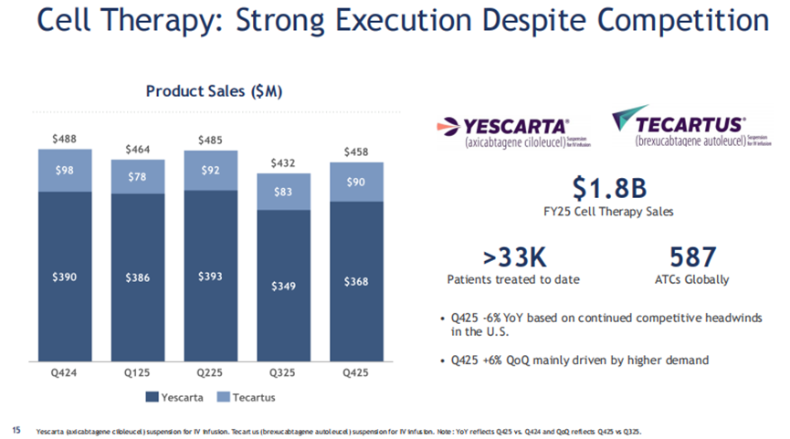 Breyanzi卖了13.58亿美元,增幅81.8%,作为增长快速的头部产品。其成功得益于适应症持续拓展。2025年第四季度在欧美分别获批边缘区淋巴瘤和套细胞淋巴瘤适应症,TRANSCEND FL研究显示在MZL患者中客观缓解率达95.5%,24个月缓解持续率90.1%。它的优势在于制造工艺比较成熟,生产周期短,患者等待时间少。