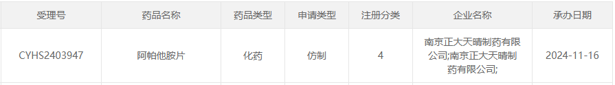 11月16日,据CDE官网最新公示,南京正大天晴提交的4类仿制药阿帕他胺片上市申请获受理。据摩熵医药数据库显示,目前该品种暂无国内药企获批,原研产品2023年在全国院内市场的销售额超4亿元。