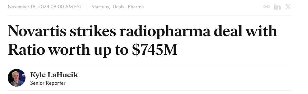 11月18日,放射性制药公司Ratio Therapeutics宣布,已与诺华达成达成了全球独家授权和合作协议。此次合作利用Ratio的放射配体疗法的技术平台,开发用于癌症的生长抑素受体2 (SSTR2)放射治疗候选药物。